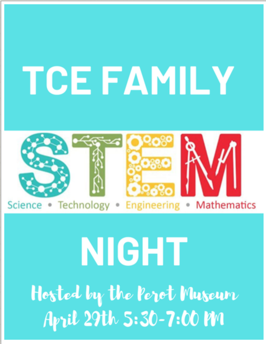 STEM Night!Join us this Monday for TCE Family STEM Night hosted by the Perot Museum. Bring the whole family and join us for a great night of exploring and learning!